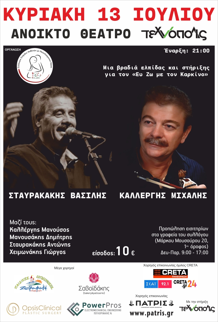 Όλοι οι καλλιτέχνες τραγουδούν αφιλοκερδώς στην υγειά όλων μας και προσφέρουν όλα τα έσοδα της παράστασης στο σύλλογο «Ευ Ζω με τον Καρκίνο» για τη στήριξη των ογκολογικών ασθενών και των οικογενειών τους.